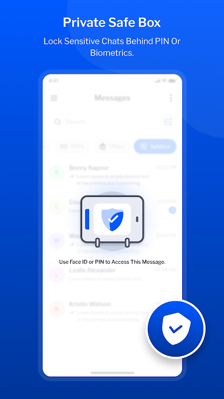 Zamknij swoje prywatne wiadomości w sejfie zabezpieczonym biometrycznie lub kodem PIN. Ukryj i zabezpiecz poufne konwersacje dzięki niezawodnej mocy wiadomości SMS.