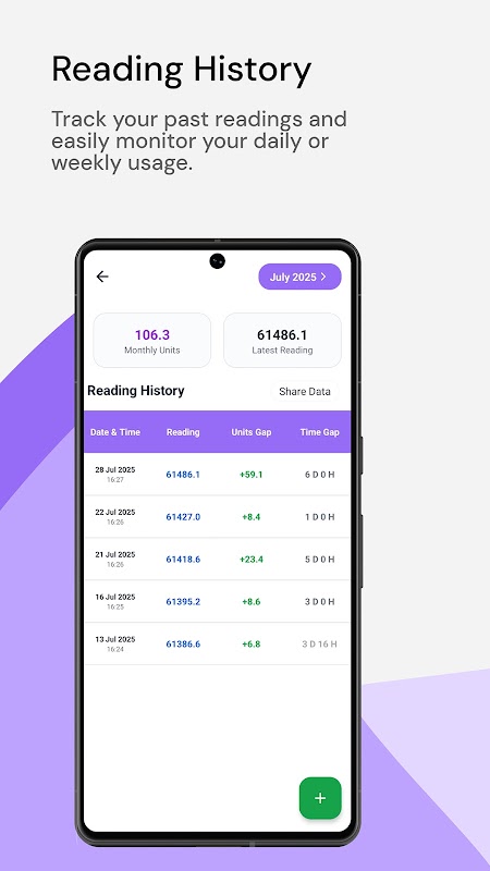 Przeglądaj poprzednie odczyty, wykresy zużycia i podsumowania miesięczne — bezpiecznie przechowywane na Twoim urządzeniu.