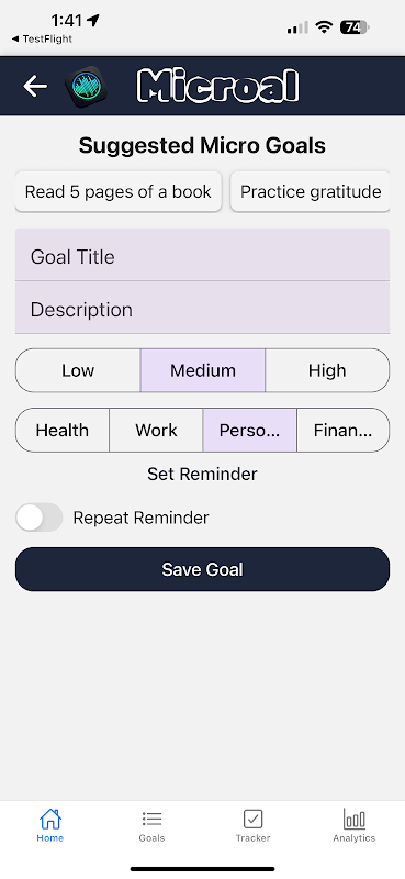 Microal to Twoja osobista aplikacja do śledzenia nawyków i wyznaczania celów, zaprojektowana, aby pomóc Ci budować spójność i utrzymać motywację. Niezależnie od tego, czy chcesz wypracować lepsze nawyki, przełamać złe, czy śledzić codzienne postępy, Microal ułatwia to dzięki intuicyjnemu interfejsowi i zaawansowanym funkcjom.