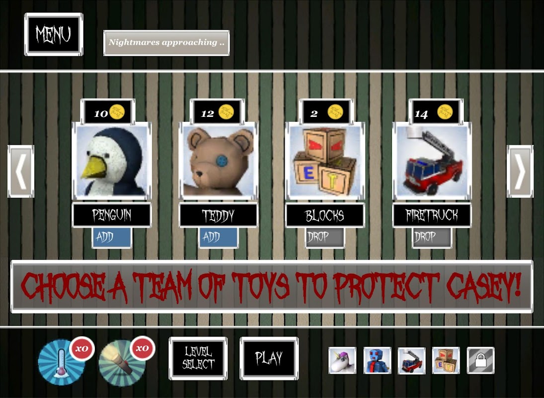 Przygotuj się, aby chronić przestraszone małe dziecko o imieniu Casey przed atakiem przerażających nocnych potworów, które utrudniają mu spokojny sen. Ale jak? Oczywiście z zabawkami Casey! Niezależnie od tego, czy używasz nakręcanego robota, który strzela prądem z ramion, czy armii żołnierzyków, którzy używają plastikowych karabinów - od Ciebie zależy, czy przerażające potwory nie dotrą do Casey. Przygotuj się na walkę z przerażającą inwazją koszmarnych potworów. Jedynym sposobem na dotarcie do rana jest użycie kombinacji zabawek w celu zbudowania silnej obrony.