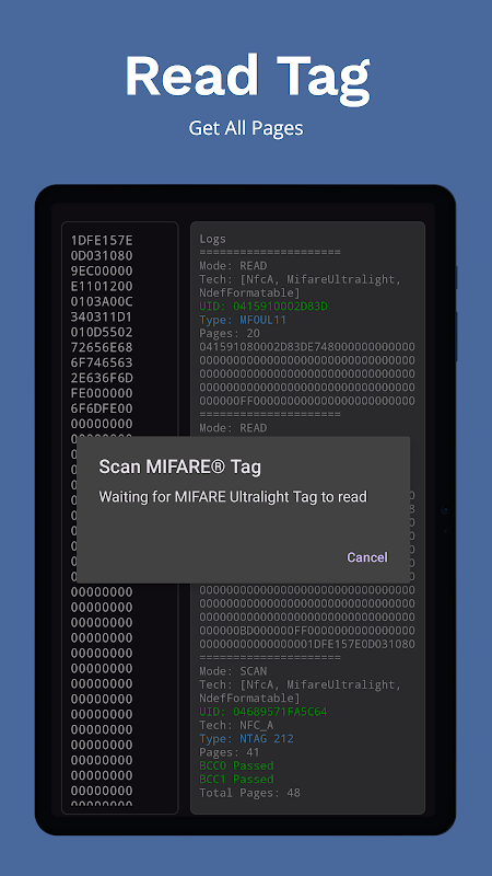 Odblokuj pełny potencjał swoich tagów MIFARE Ultralight za pomocą narzędzia MIFARE Ultralight! Ta potężna aplikacja umożliwia łatwe odczytywanie, zapisywanie i skanowanie znaczników MIFARE Ultralight, co czyni ją niezbędnym narzędziem dla programistów, hobbystów i profesjonalistów pracujących z technologią NFC. Kluczowe funkcje: