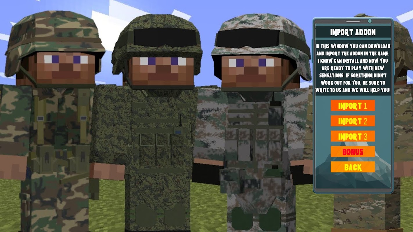 Thanks to this Military Mod, you no longer have to use boring standard tools for setting functions and characters from the standard MCPE, and a modern and interesting Military Mod for Minecraft PE with many additions will come to your aid