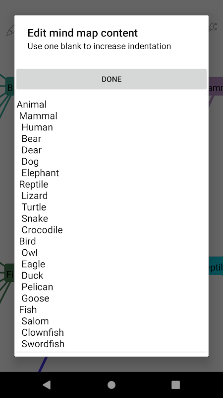 Edytuj treść mapy myśli (użyj jednego pustego miejsca, aby zwiększyć wcięcie)