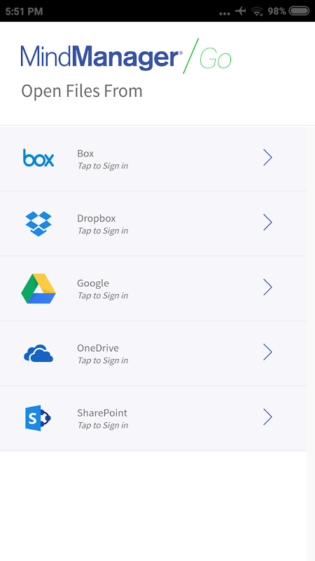 MindManager Go lets you view and navigate your MindManager files on your mobile device. See map details with crystal clarity, focus on important information with ease thanks to powerful filtering and search capabilities, and send images and text notes to your MindManager desktop with the NEW MindManager Snap capture tool. Supports classic and recent MindManager features including task information, properties, formulas, SmartRules, objects, flowcharts and more.