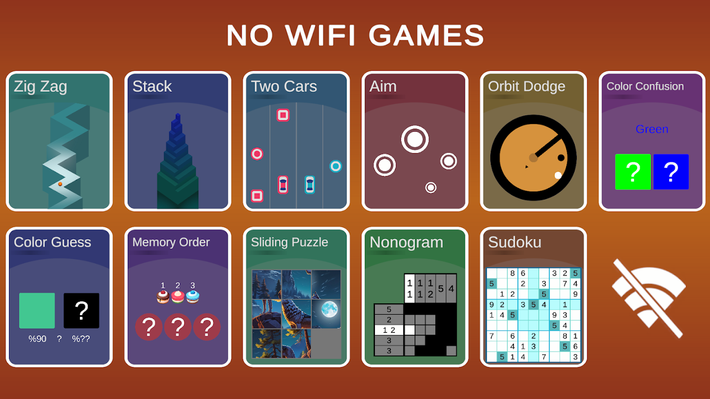 Od klasyków, takich jak Sudoku i Sliding Puzzle, po oryginały, takie jak Orbit Dodge i Color Confusion, każda gra oferuje nowe wrażenia, które wyostrzają Twoje umiejętności i rzucają wyzwanie Twojemu umysłowi. Wyostrz swoją pamięć w Memory Sequence, sprawdź swoją precyzję w Aim lub pokaż swoje szybkie myślenie w Color Confusion i Color Guess.
