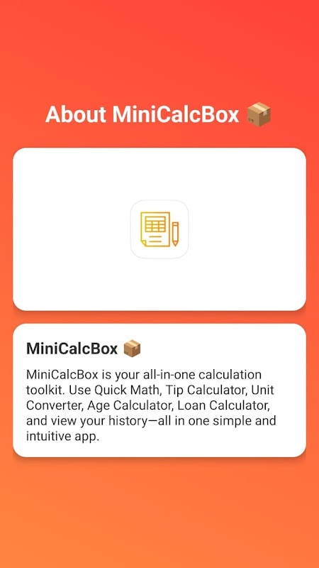Uprość swoje codzienne obliczenia dzięki MiniCalcBox 📦, najlepszej aplikacji kalkulatora, która łączy w sobie funkcje Quick Math, kalkulatora napiwków, konwertera jednostek, kalkulatora wieku, kalkulatora kredytowego i wiele innych w jednej prostej i łatwej w obsłudze aplikacji!