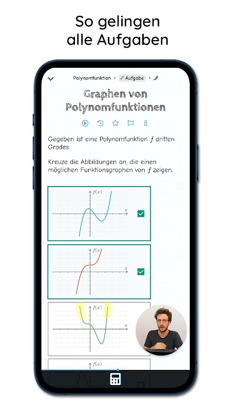 Die meisten Aufgaben (viele davon sind offizielle Zentralmatura-Aufgaben) können direkt am Smartphone und ohne weitere Hilfsmittel gelöst werden. Więc kannst du mit Miranda überall und jederzeit effizient lernen, sogar in der U-Bahn auf dem Weg zur Schule. Mit unserem Blackboard 3.0 musi być na smartfonie, który nie jest używany. Miranda jest kompletna dla optymalnego formatu Hochformat. Das Blackboard 3.0 präsentiert die handgeschriebenen Erklärungen unseres Tutors und blendet gleichzeitig sein Gesicht ein.