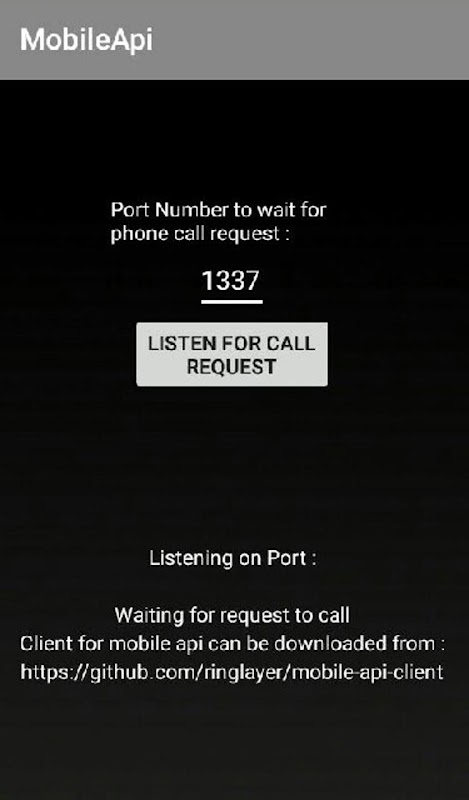 Mobile Api is an Application that will create a service to listen on specific port number defined by user. The service will start once the user click listen button. This service then will wait for specific tcp port packet containing a request to call a phone number.