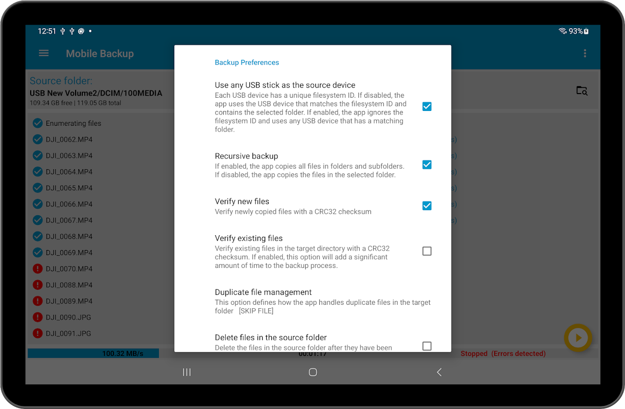 Aplikacja Mobile Photo and Video Backup umożliwia kopiowanie zdjęć i filmów przechowywanych na urządzeniach podłączonych przez USB (karty SD/MicroSD) do innych urządzeń podłączonych przez USB (dysk twardy/SSD) lub do pamięci wewnętrznej urządzenia.