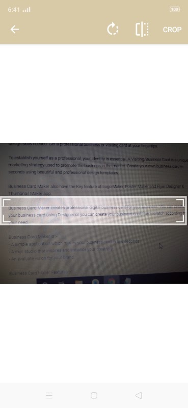 Wystarczy skaner kart i automatycznie załaduje twoją kartę w tej aplikacji użytkownika zdrapkę i zrobi zdjęcie za pomocą kamery dostępnej opcji w aplikacji na górnym pasku akcji po zrobieniu zdjęcia możesz przyciąć swoje zdjęcie, które zostanie zrobione przez kamerę Skaner lub galerię, przyciąć wybrane zdjęcie z funkcją przycinania dostępną w aplikacji, możesz ustawić swoje zdjęcie poziomo lub pionowo.