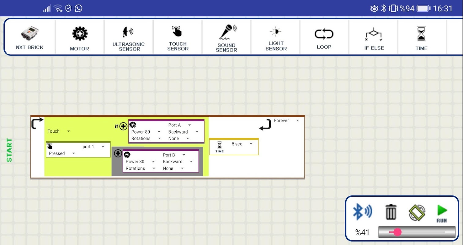 Zbuduj swój program, dodając elementy, takie jak silniki, czujniki, pętle, warunki i akcje, korzystając z prostego interfejsu „przeciągnij i upuść”. Twórz logiczne sekwencje za pomocą wizualnych bloków kodu – idealne do nauki i nauczania robotyki!