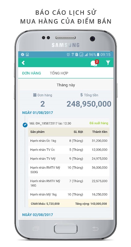 Đặt đơn hàng trực tuyến ngay tại điểm bán, đại lý bằng thiết bị di động. Tự động hóa bán hàng nhờ ghi nhớ đơn hàng, tự động tính tiền, gợi ý sản phẩm khuyến mại.