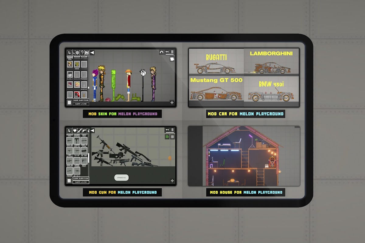 Mods Melon Playground to aplikacja, która zawiera wiele modów kolekcji dla Melon Playground. Możesz robić, co chcesz i maksymalnie wykorzystać swoją kreatywność dzięki naszej różnorodności modów. Zebraliśmy najciekawsze mody, takie jak: bronie, mody zwierząt, mody samochodów, meble, czołgi, budynki i wiele innych.