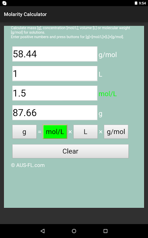 Enter positive numbers and press the buttons for this equation [g] = [mol/L] x [L] x [g/mol] to get the results.
