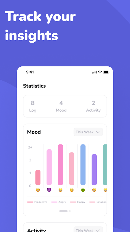 Kontroluj swój dzień, rejestrując swoje aktywności — pracę, fitness, naukę, spotkania towarzyskie, odpoczynek, hobby i wiele innych. Powiąż swoje działania z nastrojem, aby lepiej zrozumieć swoje wzorce emocjonalne i mentalne. Stwórz zdrowsze nawyki i bądź świadomy tego, jak spędzasz czas.