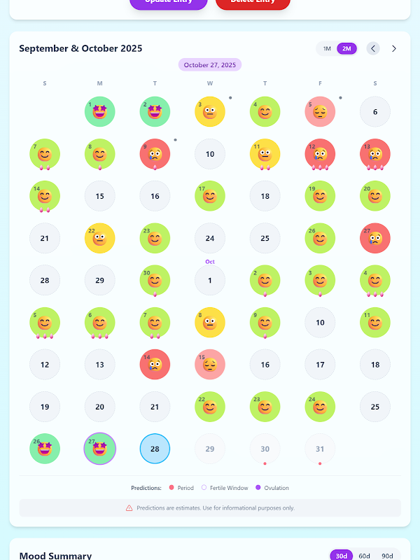 Używaj jej jako monitora nastroju, monitorowania okresu lub codziennego dziennika dobrego samopoczucia. Śledź emocje, objawy PMS, natężenie miesiączki i wiele więcej. Idealna dla każdego, kto szuka łatwego w obsłudze monitora cyklu, monitorowania emocji lub aplikacji do monitorowania zdrowia kobiet, aby zrozumieć wzorce nastroju i cyklu.