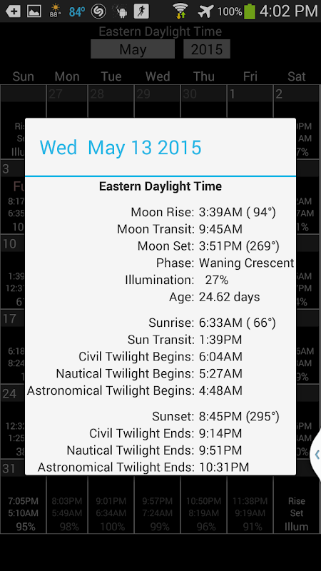 Ta aplikacja zawiera widget, który wyświetla aktualną fazę, oświetlenie, a czasy wschodu i księżyca dla bieżącej lokalizacji. Obejmuje ona także kalendarz, aby pokazać wzrost, zestaw, oświetlenie i fazy na każdy dzień miesiąca. Kliknięcie na dzień przynosi się szczegółowe informacje o wzroście księżyca i ustalonych stanowiskach, jak również informacje o wschodzie słońca i zestawu i informacji zmierzchu.