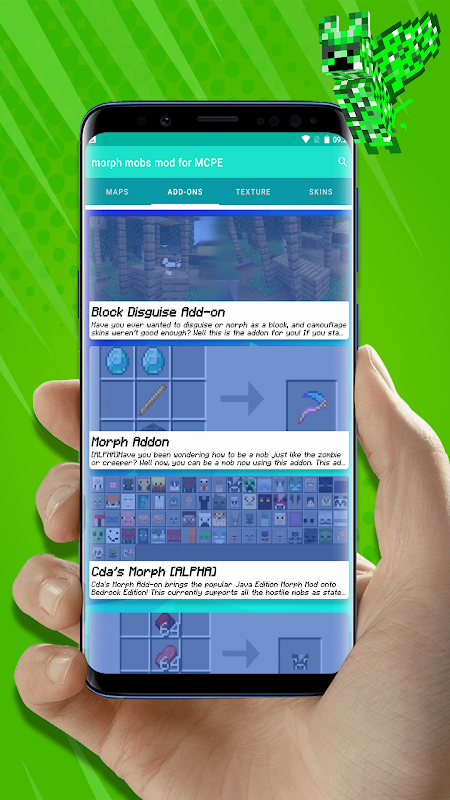 allows transformation into any monster or item. If you want to play for any monster, this morph mod is specially for mcpe!