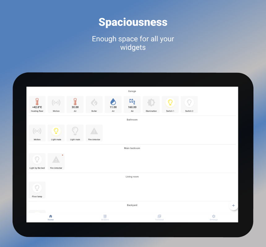 ✔ Grupowanie widżetów – Uporządkuj interfejs za pomocą zakładek i grup, aby uzyskać przejrzysty układ. ✔ Sceny – Twórz złożone scenariusze, aby wysyłać polecenia do wielu urządzeń jednocześnie za pomocą jednego przycisku.