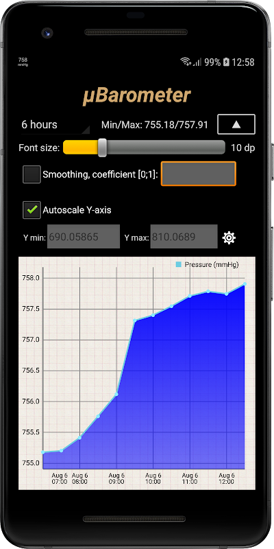 Aby zebrać dane, μBarometr uruchamia niewielki serwis, który co godzinę zapisuje wartość ciśnienia.