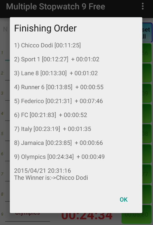 - Possibility to choose up to 9 Stopwatches simultaneously