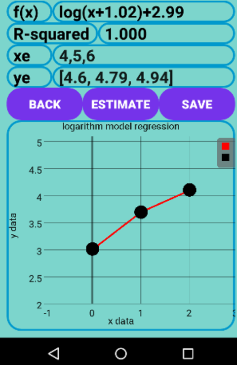 ZAPISZ: naciśnij przycisk zapisu, aby zapisać dane, dopasowany model, szacowany model przy podanych wartościach x, r-kwadrat i błąd modelu zapisane jako pliki CSV lub txt w pamięci telefonu jako „model_regresja.csv” lub „model_regresja.txt” wypełniając folder o nazwie curve_fitting_data
