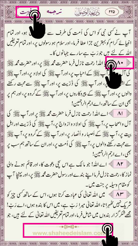In this edition, the facility of jumping to a particular page from the contents page itself has been made possible. Also, one can go through the translation of Durood Shareef by clicking on their respective numbers, and clicking on the translation number will display the text of the particular Durood Shareef on the screen.
