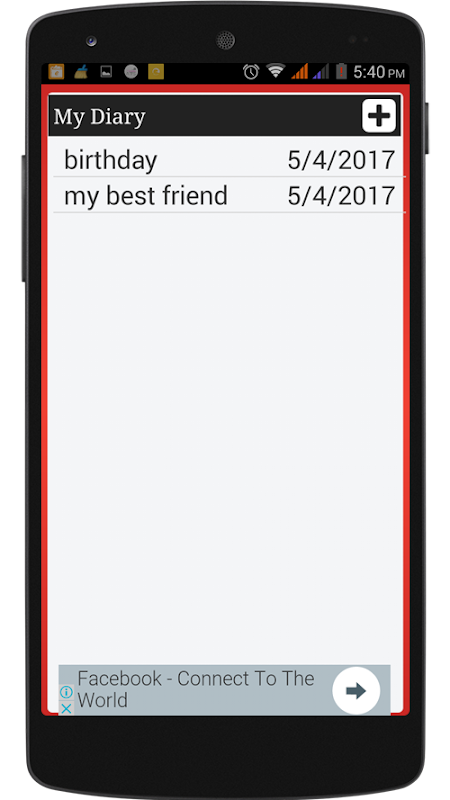 Diary is a simple application which lets you write daily thoughts/ideas/memories with a simple user interface. Add a visual touch to your memories attaching a photo.