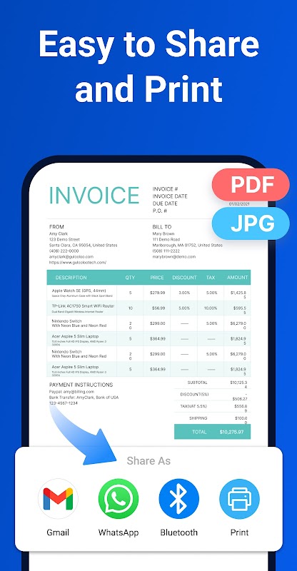 Invoice Maker - Easy Estimate Maker i Invoice Maker to dedykowana aplikacja do fakturowania, która umożliwia tworzenie faktur i wycen. To sprawdzona i prosta w obsłudze aplikacja do fakturowania dla osób samozatrudnionych, właścicieli małych firm itp. Dzięki Invoice Maker i Invoice Now możesz samodzielnie tworzyć profesjonalne wyceny i faktury. Możesz również tworzyć faktury natychmiastowe i łatwo nimi zarządzać za pomocą tej darmowej aplikacji do tworzenia faktur.
