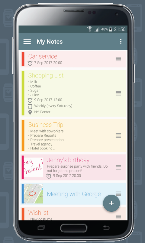 „Moje Notatki w biegu” przynosi swoje notatki i listy kontrolne do nadgarstka, ponieważ jest dostępny dla smartwatches Samsung Gear. Zobacz swoje notatki i załączniki graficzne, sprawdzić swoje zadania do wykonania, edytować swoich przypomnień i otrzymywać powiadomienia na swój sprzęt.