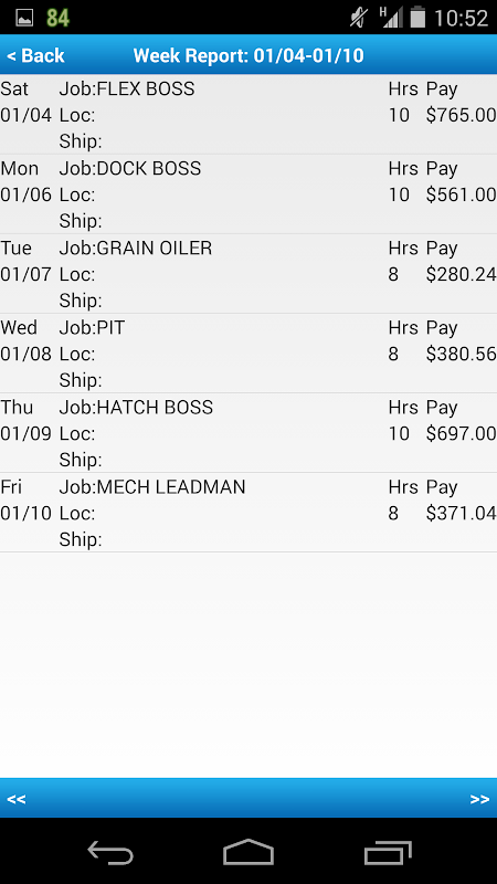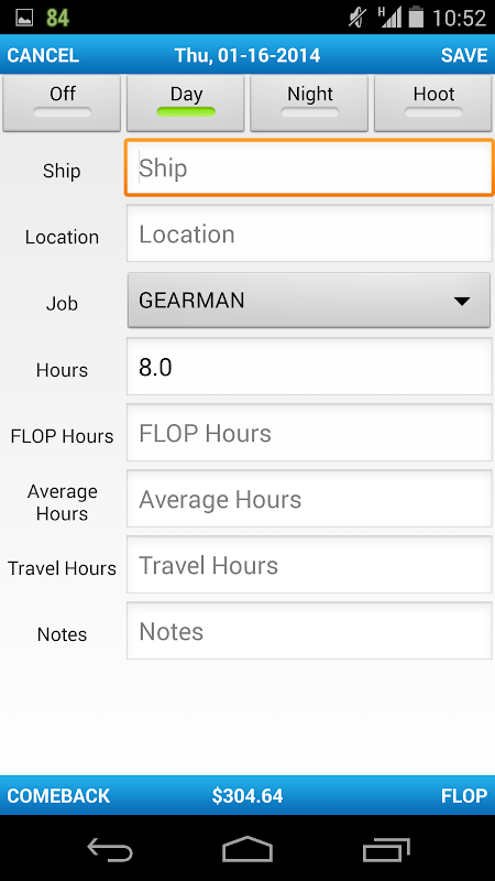 - Wprowadź codzienne zdarzenia pracy z następującymi informacjami: zmiana, statek, lokalizacja, praca, godziny, godziny flopa, średnie godziny, godziny podróży i notatki.