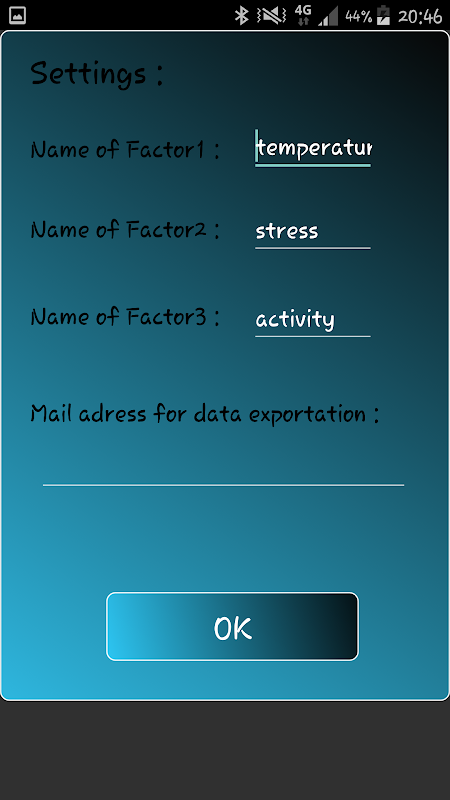- Po zainstalowaniu naciśnij konfigurację "ołówka", aby nazwać 3 czynniki, które chcesz śledzić, i dokładny adres e-mail, kiedy wysłać / wyeksportować dane (opcjonalnie).