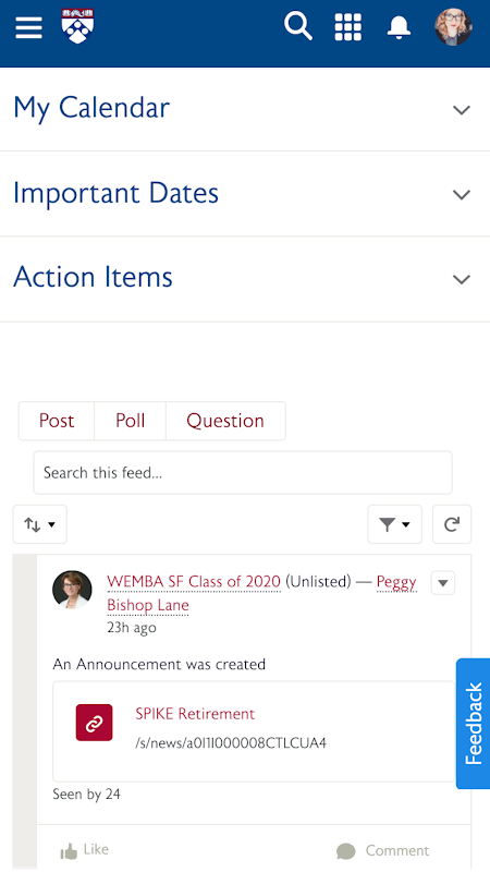 MyWharton Mobile to mobilna studencka wersja MyWharton, która zapewnia centralną lokalizację dla wszystkich informacji potrzebnych uczniom i udostępnia je na urządzeniach z Androidem. Zalety aplikacji mobilnej obejmują stałe powiadomienia logowania i powiadomień push oraz najlepsze funkcje witryny MyWharton: