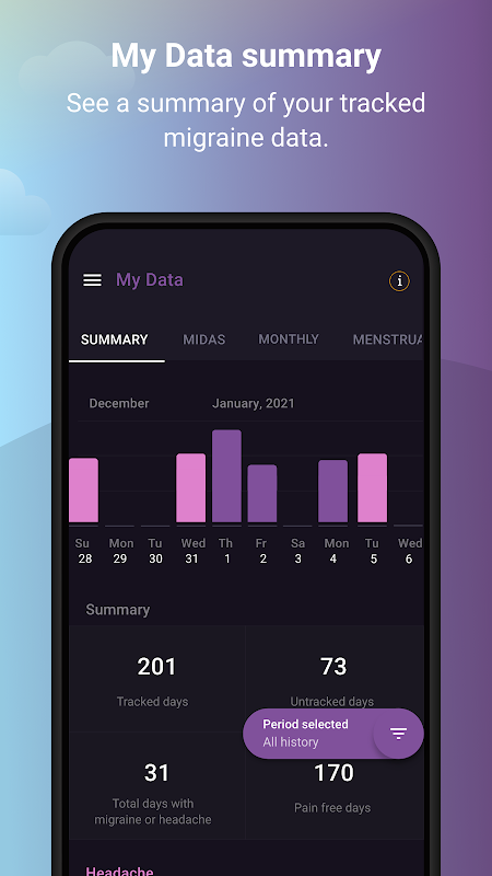 * Podsumowanie - zobacz przegląd liczby dni śledzonych w porównaniu z dniami, które nie są śledzone. Zobacz, ile masz bezbolesnych dni oraz ile doświadczyłeś migreny i innych bólów głowy.