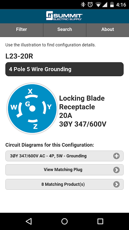 NEMA zasilanie elektryczne Konfiguracja szczytu Przewodnik stawia ponad 240 konfiguracji NEMA na wyciągnięcie ręki. Ta aplikacja pomoże Ci szybko i łatwo zidentyfikować urządzenia, dzięki czemu można poruszać się z projektu. Szukanie według numeru konfiguracji NEMA lub wprowadzić znaną informacji takich jak napięcie, natężenie lub biegunów do filtrowania dopasowań. Dotknij ikony i zobacz szczegółową specyfikację. Użyj Poręczne plug / zbiorniki krzyż opcję odniesienia, aby szybko znaleźć pasujące konfiguracje.