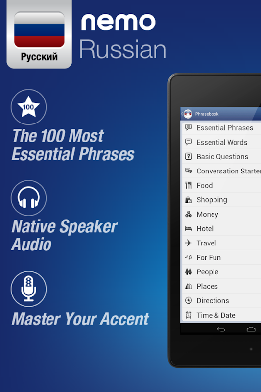 Nemo jest przeznaczony do początku mówisz najbardziej przydatnych słów w języku rosyjskim bezpośrednio i pewnie. Z milionów pobrań z całego świata, Nemo jest dostępna dla telefonów z systemem Android i tabletek.