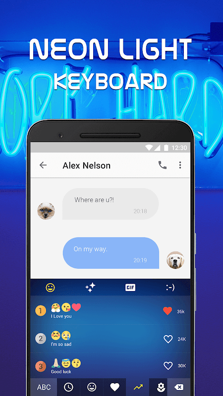 -Neon Light Keyboard Theme only works with Facemoji Keyboard + GIFS installed on your phone. If you don’t have it, you will be automatically led to the Google Play download link,then download and choose Facemoji Keyboard + GIFS as your default keyboard.