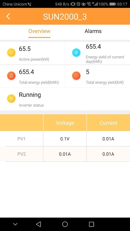 NetEco APP: Remotely monitors the KPI data such as energy yield and income as well as alarm information of inverters.