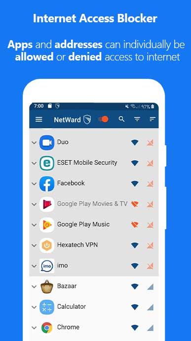 Applications and addresses can individually be allowed or denied access to your Wi-Fi and/or mobile connection.