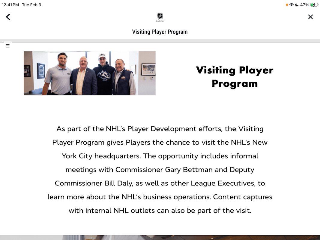 - Dostęp do wszystkich zasobów rozwoju zawodników NHL, w tym: Edukacja i Rozwój Kariery (AthLife), Program Orientacji Zawodników NHL/NHLPA, Obóz Treningowy Transmisyjny, Program Zaangażowania Zawodników Fanatics, Program Zawodników Gościnnych, Zdrowie Psychiczne (Headspace), inicjatywy „Naucz się grać w hokeja” oraz Stowarzyszenie Trenerów NHL.
