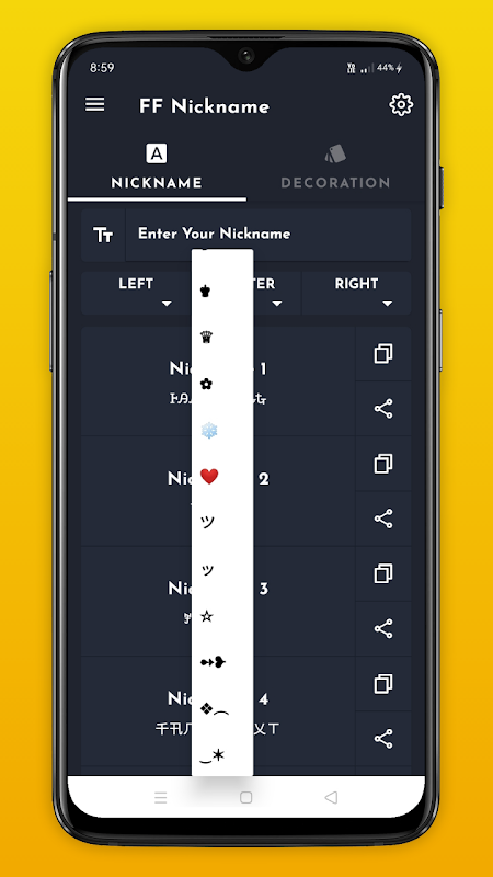 Nickname generator is a simple application for creating Cool nickname & stylish symbolic name. Generated Nickname can easily use in free fire game and other games. Also you can generate cool amazing decoration and stylish text for chatting.