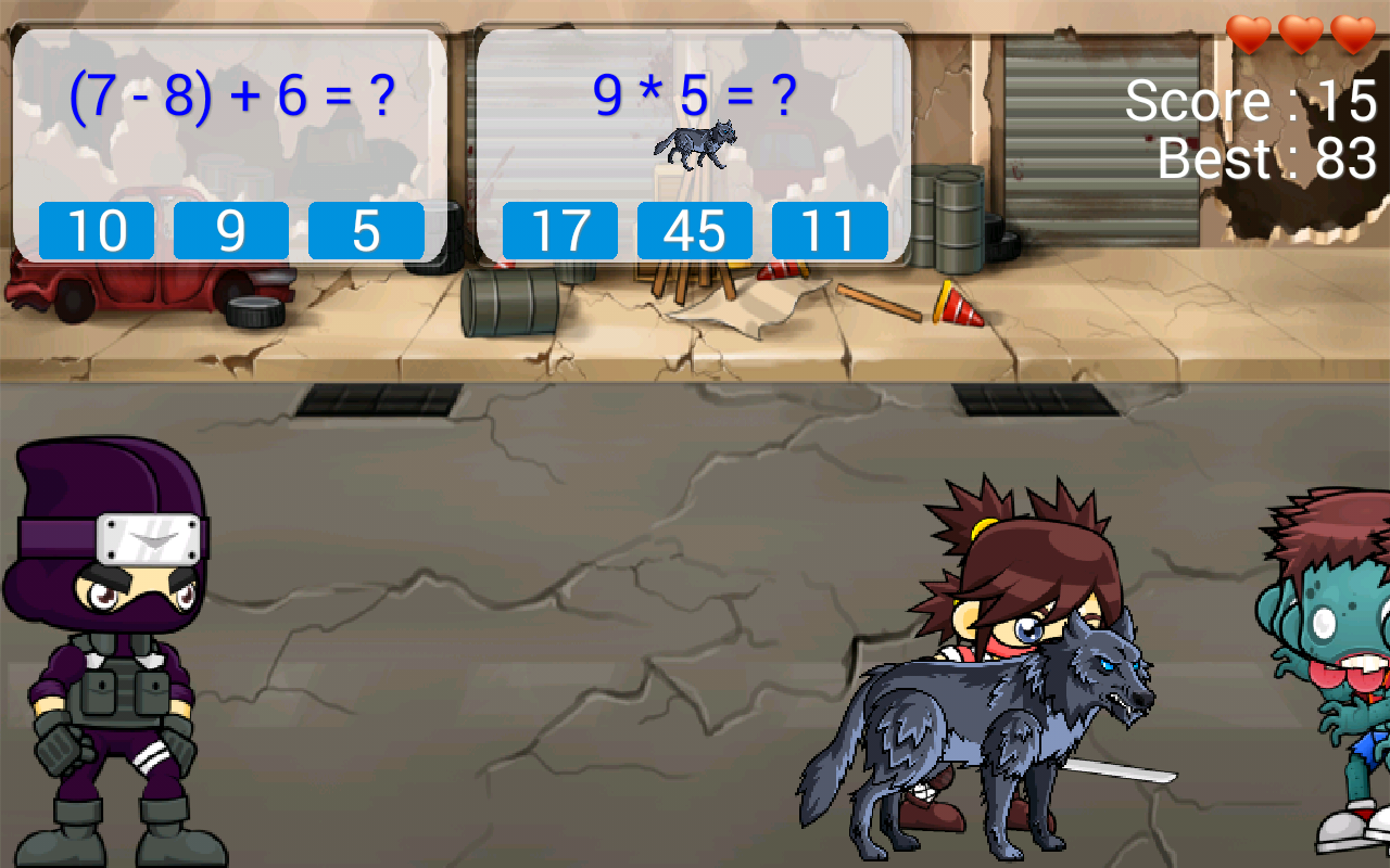 The math questions on the left are harder than the middle one. But if you answer the question in the panel on the left, the ninja girl can help you. Meanwhile, I have a warning to you that the zombies will accelerate gradually. When the zombies speed up, you may need to use both panels at the same time.