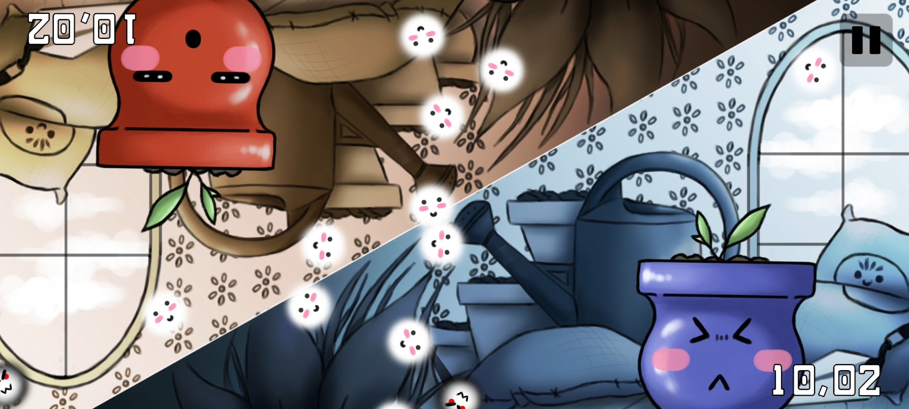 Jest to gra dla 2 osób na jednym ekranie. Złap więcej szczęśliwych nasion i nie dotykaj złych nasion. Wyniki są ukryte, ponieważ na końcu garnki są puste i wyświetlany jest wynik.