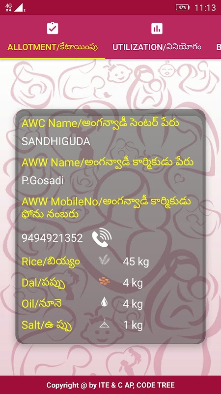 In this user can select District,Mandal,Village and Anganwadi center, based on Above selection we will populate Utilization details of previous month,Allotment Details of Next month, Beneficiary details,Nutrition Information.