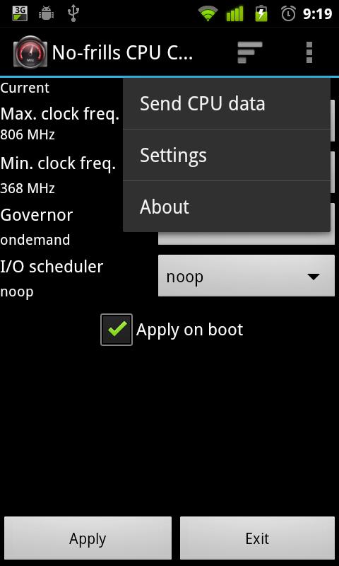 Be wary of the frequencies you select! Your phone may lock or become unresponsive if it doesn't like extreme values, but -hey- better safe than sorry: even though No-frills CPU Control allows you to choose if you want to apply the settings on boot, it comes with an extra "safety valve" too! If the device doesn't shut down (or reboot) in a clean way, it will not apply the settings, avoiding those nasty boot-loops you may have had with other overclocking apps. Please keep in mind that apps like QuickBoot are as quick as they are unsafe…
