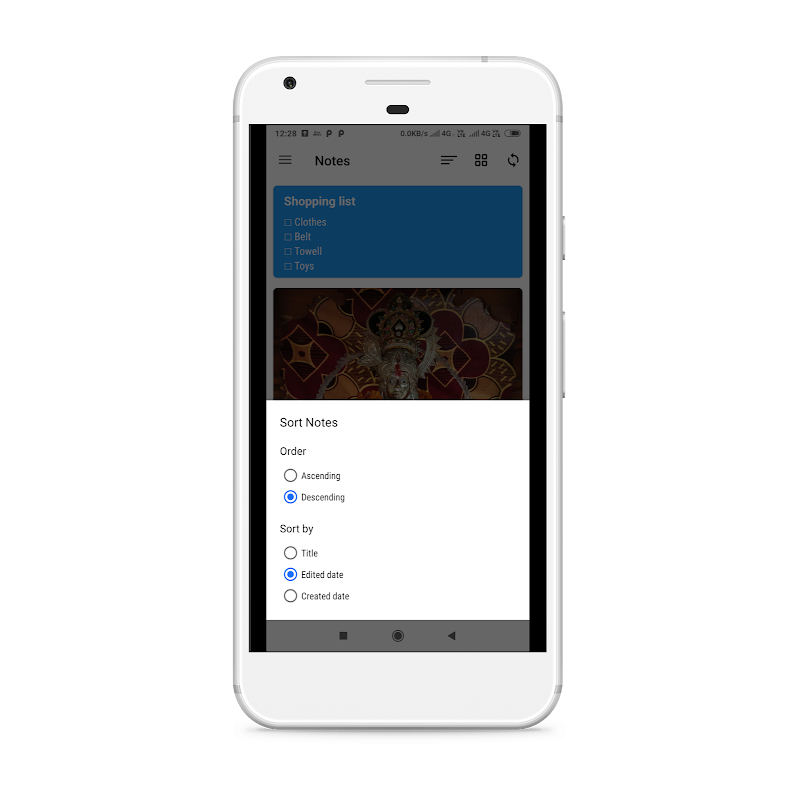 - Sortowanie notatek z rosnącym, malejącym, tytułem, godziną, datą utworzenia.