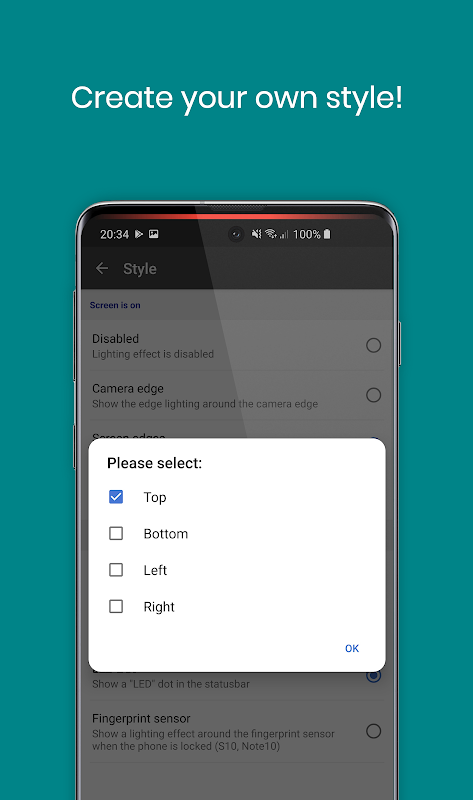 Możesz wybierać różne style diod powiadomień i wyświetlać je wokół wycięcia aparatu, krawędzi ekranu, a nawet symulować kropkę LED powiadomienia na pasku stanu telefonu!