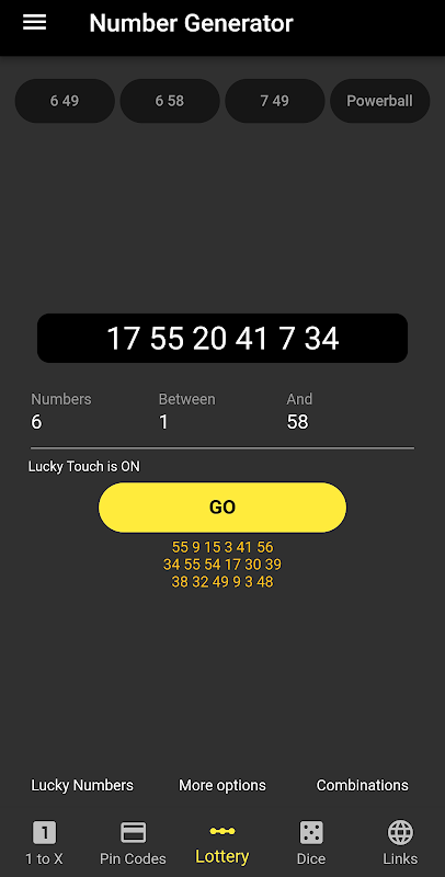 - Lucky Touch daje odrobinę szczęścia. Numery są dostrojone do kliknięcia przycisku Generuj, który działa jak losowa siatka liczb