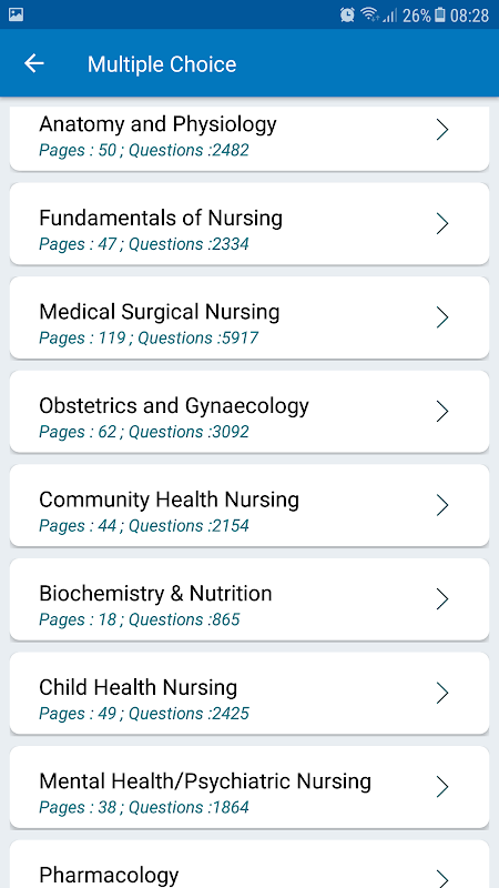 MCQ on Anatomy and Physiology, Fundamentals of Nursing, Medical Surgical Nursing, Obstetrics and Gynaecology, Community Health Nursing, Biochemistry, Nutrition, Child Health Nursing, Peadiatric Nursing, Mental Health Nursing, Psychiatric Nursing, Pharmacology, Microbiology, Psychology, Sociology, Genetics, Nursing Research included in the App