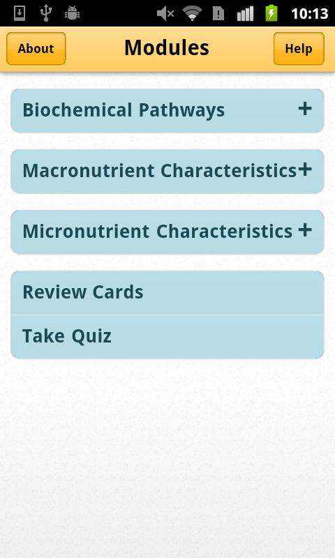 This application was designed as a tool for students to learn about the processes of glycogen, carbohydrate, lipid and protein metabolism, as well as the structures and properties of macro-(carbohydrates, lipids, proteins and nucleic acids) and micronutrients (vitamins and minerals).